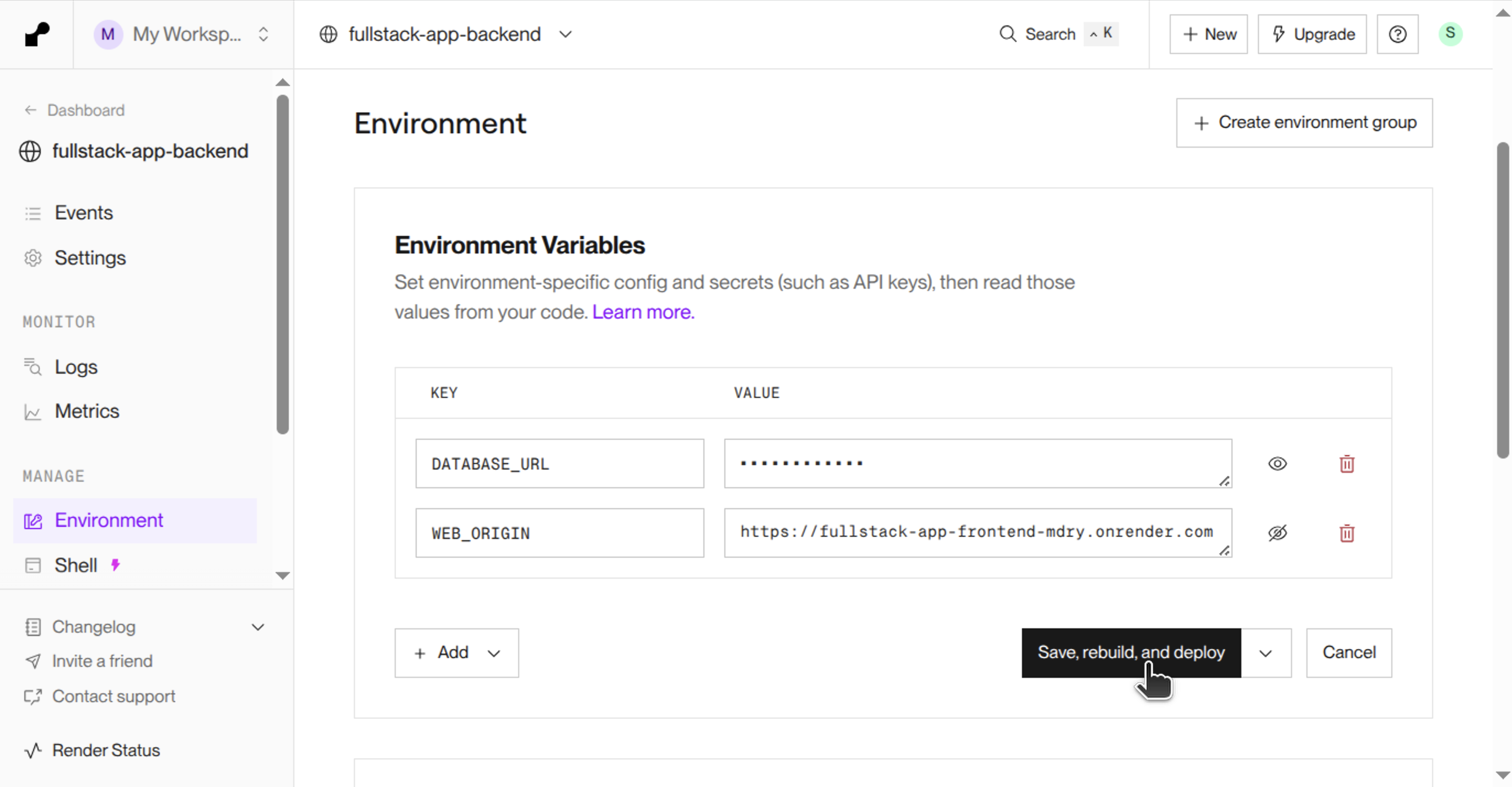 DATABASE_URLでデータベースへの接続情報を設定します。環境変数WEB_ORIGINは、ひとまず空のままにしておきます。